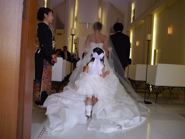 ドレスのトレーンをお子さまにお持ちいただくお手伝いをして頂き、バージンロードを進んで頂きます。